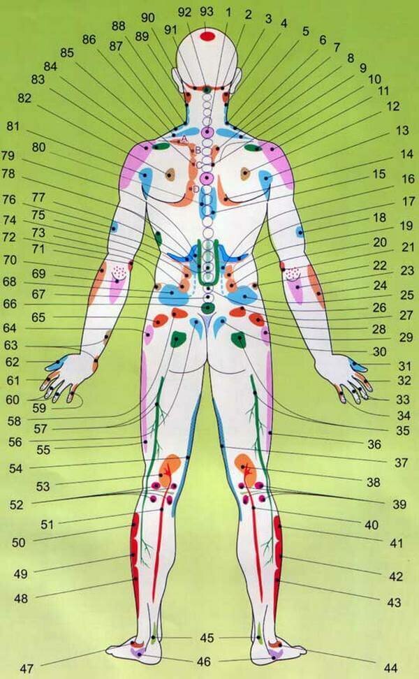 - Pohlavné orgány (ľavá strana). Zóny sa nachádzajú pod veľkým sedacím svalom na ľavej strane krížov. Prejavuje sa bolestivosťou v tejto oblasti a pálčivými bolesťami.